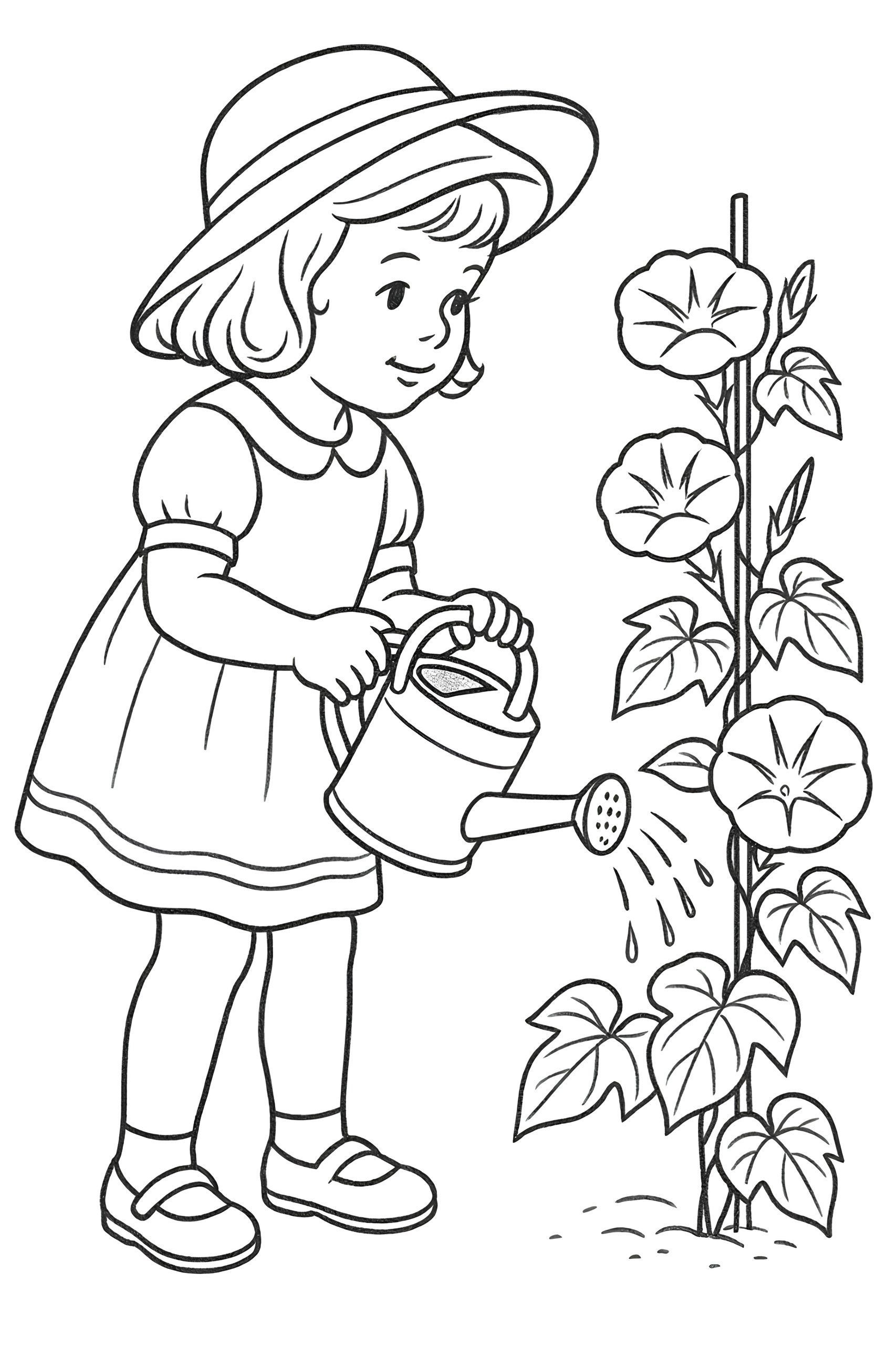【高齢者向け塗り絵】朝顔に水をあげる女の子